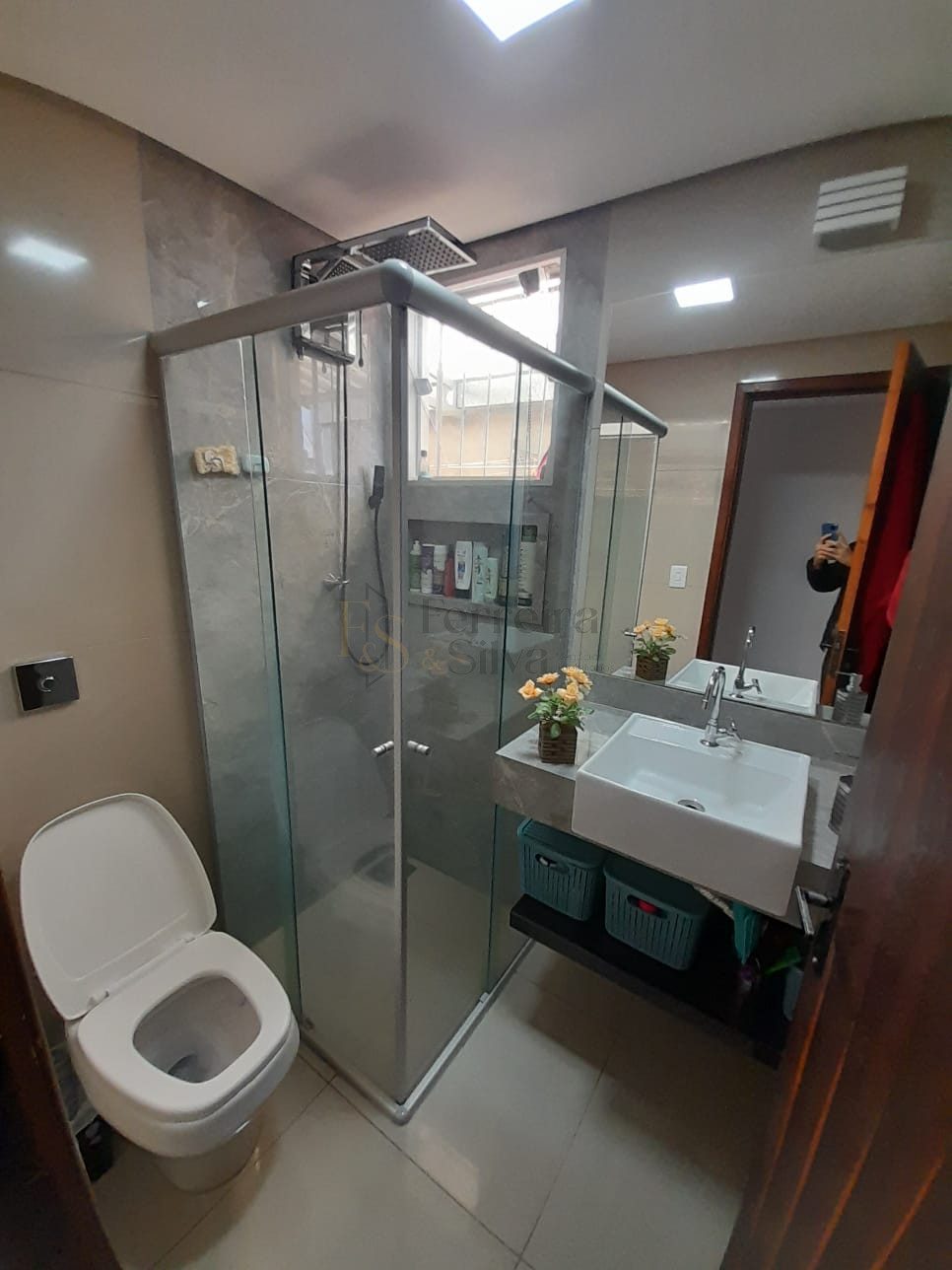 - Banheiro social todo em porcelanato com box e espelho